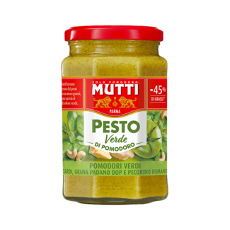 Mutti® Pesto Verde z zielonych pomidorów - to perfekcyjna kompozycja włoskich zielonych pomidorów i tradycyjnych serów Grana Padano i Pecorino Romano (sera z mleka owczego) oraz aromatycznej bazylii i orzechów nerkowca. Receptura wyróżnia się wysoką zawartością pomidorów (ponad 50%) i ograniczoną zawartością oleju i soli. Produkt jest BEZGLUTENOWY i odpowiedni dla WEGETARIAN.