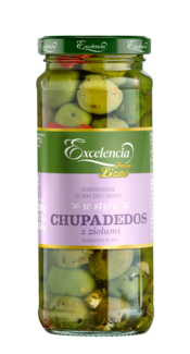 Marynowane oliwki drylowane w stylu CHUPADEDOS! Zielone oliwki znane jako Castelvetrano we Włoszech, Picholine we Francji lub Green Ripes w USA, zachwycają swą chrupkością oraz intensywnie zieloną barwą. Dodatek czerwonej papryki, czosnku oraz starannie dobrana kompozycja ziół nadaje im wyrazisty, naturalnie świeży i wyrazisty smak. Oliwki bogate w cynk.